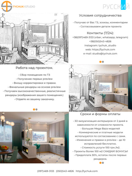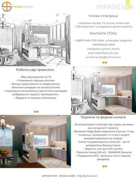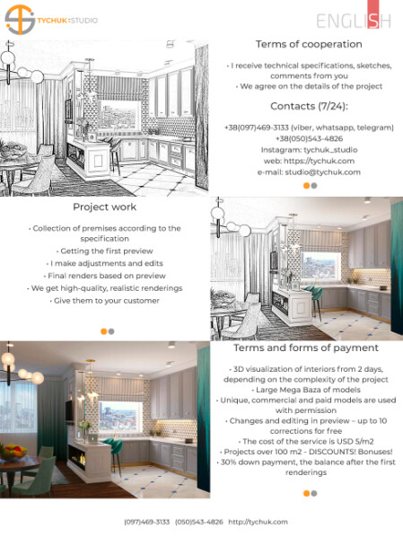 Визуализация будущих интерьеров, будет интересна и полезна, как дизайнерам, так и заказчикам. Позволяет увидеть внешний вид комнаты, квартиры, коттеджа или офиса. По ходу ремонта что то дополнить, отредактировать или изменить. Мы работаем с дизайнерами, архитекторами, прорабами и с конечными заказчиками владельцами жилых, офисных и торговых помещений.
